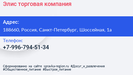 Элис, торговая компания по адресу 188660, Россия, Санкт-Петербург, Шоссейная, 1а в дальнейшем Организация, размещена в следующих категориях: