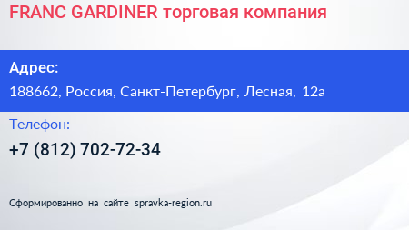 FRANC GARDINER, торговая компания по адресу 188662, Россия, Санкт-Петербург, Лесная, 12а в дальнейшем Организация, размещена в следующих категориях: