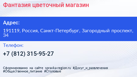 Фантазия, цветочный магазин по адресу 191119, Россия, Санкт-Петербург, Загородный проспект, 34 в дальнейшем Организация, размещена в следующих категориях: