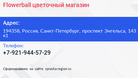 Flowerball, цветочный магазин по адресу 194358, Россия, Санкт-Петербург, проспект Энгельса, 143 к1 в дальнейшем Организация, размещена в следующих категориях: