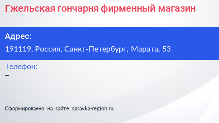 Гжельская гончарня, фирменный магазин по адресу 191119, Россия, Санкт-Петербург, Марата, 53 в дальнейшем Организация, размещена в следующих категориях: