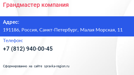 Грандмастер, компания по адресу 191186, Россия, Санкт-Петербург, Малая Морская, 11 в дальнейшем Организация, размещена в следующих категориях: