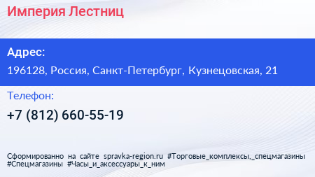 Империя Лестниц по адресу 196128, Россия, Санкт-Петербург, Кузнецовская, 21 в дальнейшем Организация, размещена в следующих категориях: