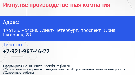 Импульс, производственная компания по адресу 196135, Россия, Санкт-Петербург, проспект Юрия Гагарина, 23 в дальнейшем Организация, размещена в следующих категориях: