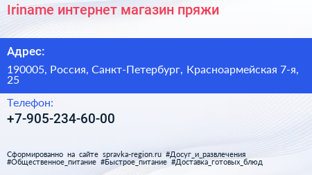 Iriname, интернет-магазин пряжи по адресу 190005, Россия, Санкт-Петербург, Красноармейская 7-я, 25 в дальнейшем Организация, размещена в следующих категориях:
