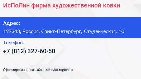 ИсПоЛин, фирма художественной ковки по адресу 197343, Россия, Санкт-Петербург, Студенческая, 10 в дальнейшем Организация, размещена в следующих категориях: