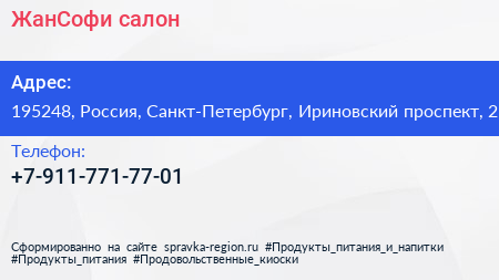 ЖанСофи, салон по адресу 195248, Россия, Санкт-Петербург, Ириновский проспект, 2 в дальнейшем Организация, размещена в следующих категориях:
