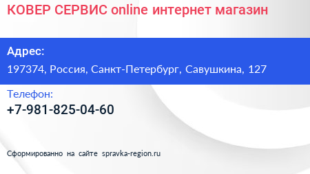 КОВЕР-СЕРВИС online, интернет-магазин по адресу 197374, Россия, Санкт-Петербург, Савушкина, 127 в дальнейшем Организация, размещена в следующих категориях: