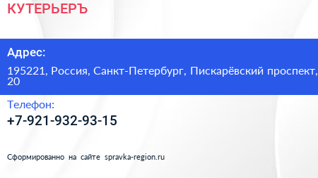 КУТЕРЬЕРЪ по адресу 195221, Россия, Санкт-Петербург, Пискарёвский проспект, 20 в дальнейшем Организация, размещена в следующих категориях: