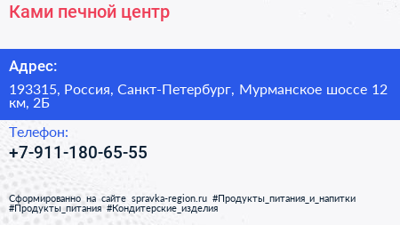 Ками, печной центр по адресу 193315, Россия, Санкт-Петербург, Мурманское шоссе 12 км, 2Б в дальнейшем Организация, размещена в следующих категориях: