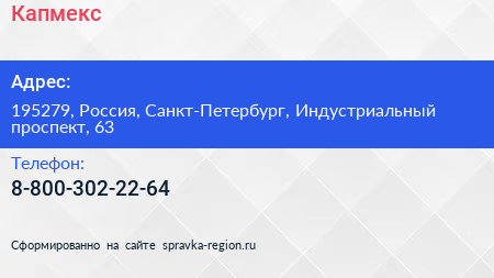 Капмекс по адресу 195279, Россия, Санкт-Петербург, Индустриальный проспект, 63 в дальнейшем Организация, размещена в следующих категориях: