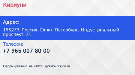 Кивиуни по адресу 195279, Россия, Санкт-Петербург, Индустриальный проспект, 71 в дальнейшем Организация, размещена в следующих категориях: