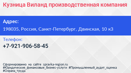 Кузница Виланд, производственная компания по адресу 198035, Россия, Санкт-Петербург, Двинская, 10 к3 в дальнейшем Организация, размещена в следующих категориях: