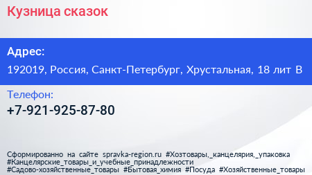 Кузница сказок по адресу 192019, Россия, Санкт-Петербург, Хрустальная, 18 лит В в дальнейшем Организация, размещена в следующих категориях: