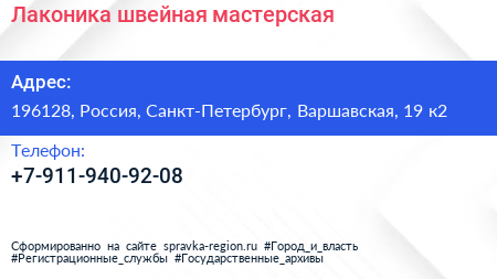 Лаконика, швейная мастерская по адресу 196128, Россия, Санкт-Петербург, Варшавская, 19 к2 в дальнейшем Организация, размещена в следующих категориях: