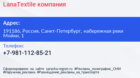 LanaTextile, компания по адресу 191186, Россия, Санкт-Петербург, набережная реки Мойки, 1 в дальнейшем Организация, размещена в следующих категориях: