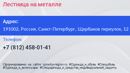 Лестница на металле по адресу 191002, Россия, Санкт-Петербург, Щербаков переулок, 12 в дальнейшем Организация, размещена в следующих категориях: