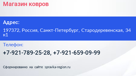 Магазин ковров по адресу 197372, Россия, Санкт-Петербург, Стародеревенская, 34 к1 в дальнейшем Организация, размещена в следующих категориях: