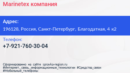 Marinetex, компания по адресу 196128, Россия, Санкт-Петербург, Благодатная, 4 к2 в дальнейшем Организация, размещена в следующих категориях:
