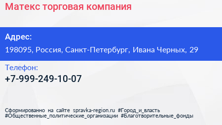 Матекс, торговая компания по адресу 198095, Россия, Санкт-Петербург, Ивана Черных, 29 в дальнейшем Организация, размещена в следующих категориях: