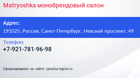 Matryoshka, монобрендовый салон по адресу 191025, Россия, Санкт-Петербург, Невский проспект, 49 в дальнейшем Организация, размещена в следующих категориях: