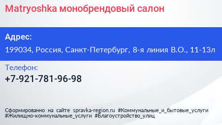 Matryoshka, монобрендовый салон по адресу 199034, Россия, Санкт-Петербург, 8-я линия В.О., 11-13л в дальнейшем Организация, размещена в следующих категориях: