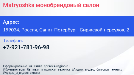 Matryoshka, монобрендовый салон по адресу 199034, Россия, Санкт-Петербург, Биржевой переулок, 2 в дальнейшем Организация, размещена в следующих категориях: