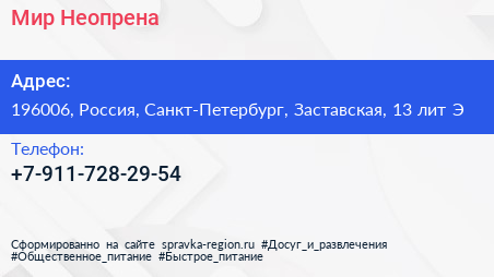 Мир Неопрена по адресу 196006, Россия, Санкт-Петербург, Заставская, 13 лит Э в дальнейшем Организация, размещена в следующих категориях: