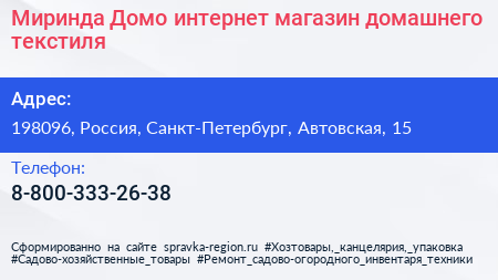 Миринда Домо, интернет-магазин домашнего текстиля по адресу 198096, Россия, Санкт-Петербург, Автовская, 15 в дальнейшем Организация, размещена в следующих категориях: