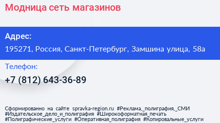 Модница, сеть магазинов по адресу 195271, Россия, Санкт-Петербург, Замшина улица, 58а в дальнейшем Организация, размещена в следующих категориях: