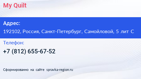 My Quilt по адресу 192102, Россия, Санкт-Петербург, Самойловой, 5 лит С в дальнейшем Организация, размещена в следующих категориях: