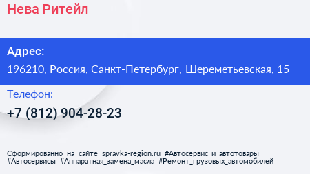 Нева-Ритейл по адресу 196210, Россия, Санкт-Петербург, Шереметьевская, 15 в дальнейшем Организация, размещена в следующих категориях: