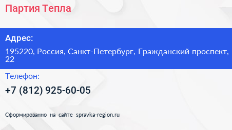 Партия Тепла по адресу 195220, Россия, Санкт-Петербург, Гражданский проспект, 22 в дальнейшем Организация, размещена в следующих категориях: