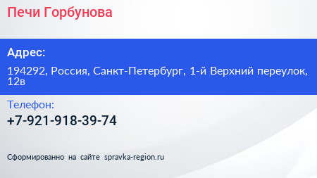 Печи Горбунова по адресу 194292, Россия, Санкт-Петербург, 1-й Верхний переулок, 12в в дальнейшем Организация, размещена в следующих категориях: