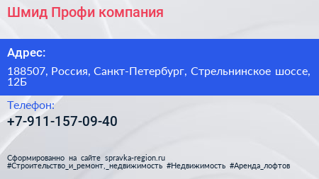 Шмид Профи, компания по адресу 188507, Россия, Санкт-Петербург, Стрельнинское шоссе, 12Б в дальнейшем Организация, размещена в следующих категориях: