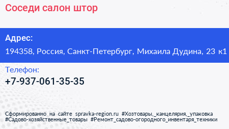 Соседи, салон штор по адресу 194358, Россия, Санкт-Петербург, Михаила Дудина, 23 к1 в дальнейшем Организация, размещена в следующих категориях: