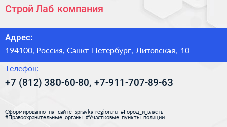 Строй Лаб, компания по адресу 194100, Россия, Санкт-Петербург, Литовская, 10 в дальнейшем Организация, размещена в следующих категориях: