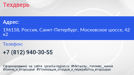 Техдверь по адресу 196158, Россия, Санкт-Петербург, Московское шоссе, 42 к2 в дальнейшем Организация, размещена в следующих категориях: