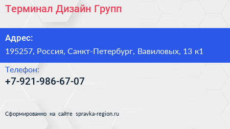 Терминал Дизайн Групп по адресу 195257, Россия, Санкт-Петербург, Вавиловых, 13 к1 в дальнейшем Организация, размещена в следующих категориях: