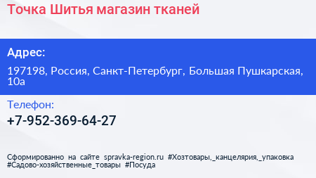 Точка Шитья, магазин тканей по адресу 197198, Россия, Санкт-Петербург, Большая Пушкарская, 10а в дальнейшем Организация, размещена в следующих категориях: