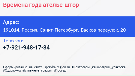 Времена года, ателье штор по адресу 191014, Россия, Санкт-Петербург, Басков переулок, 20 в дальнейшем Организация, размещена в следующих категориях: