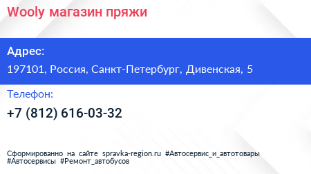 Wooly, магазин пряжи по адресу 197101, Россия, Санкт-Петербург, Дивенская, 5 в дальнейшем Организация, размещена в следующих категориях: