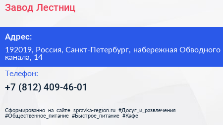 Завод Лестниц по адресу 192019, Россия, Санкт-Петербург, набережная Обводного канала, 14 в дальнейшем Организация, размещена в следующих категориях: