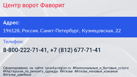 Центр ворот Фаворит по адресу 196128, Россия, Санкт-Петербург, Кузнецовская, 22 в дальнейшем Организация, размещена в следующих категориях: