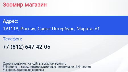 Зоомир, магазин по адресу 191119, Россия, Санкт-Петербург, Марата, 61 в дальнейшем Организация, размещена в следующих категориях: