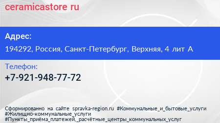 ceramicastore.ru по адресу 194292, Россия, Санкт-Петербург, Верхняя, 4 лит А в дальнейшем Организация, размещена в следующих категориях: