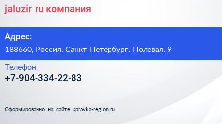 jaluzir.ru, компания по адресу 188660, Россия, Санкт-Петербург, Полевая, 9 в дальнейшем Организация, размещена в следующих категориях: