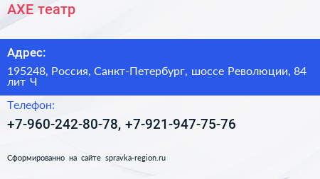 АХЕ, театр по адресу 195248, Россия, Санкт-Петербург, шоссе Революции, 84 лит Ч в дальнейшем Организация, размещена в следующих категориях: