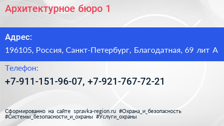 Архитектурное бюро №1 по адресу 196105, Россия, Санкт-Петербург, Благодатная, 69 лит А в дальнейшем Организация, размещена в следующих категориях: