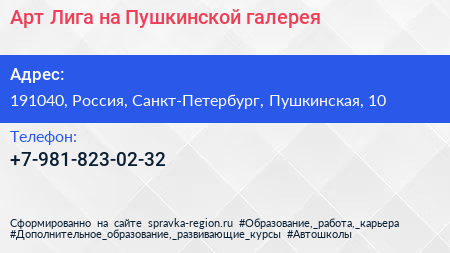 Арт-Лига на Пушкинской, галерея по адресу 191040, Россия, Санкт-Петербург, Пушкинская, 10 в дальнейшем Организация, размещена в следующих категориях: